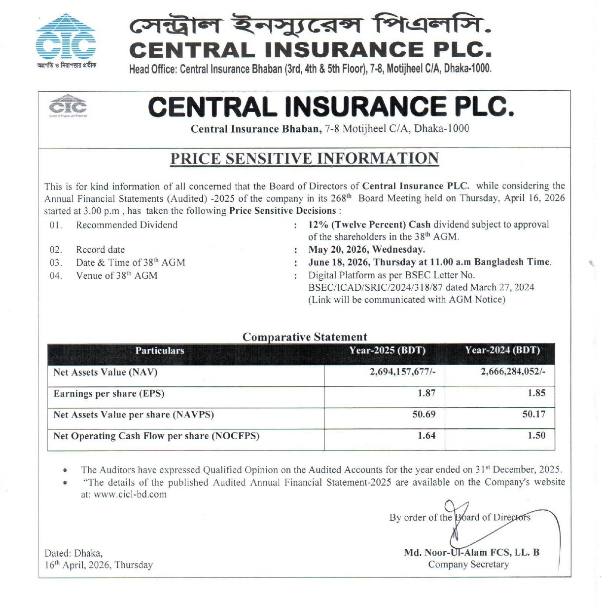 Notice is hereby given that the 38th Annual General Meeting of CENTRAL INSURANCE COMPANY LIMITED (CICL) will be held on WEDNESDAY, MAY 20, 2026 at 11.00 a.m. Bangladesh Time in DIGITAL PLATFORM.